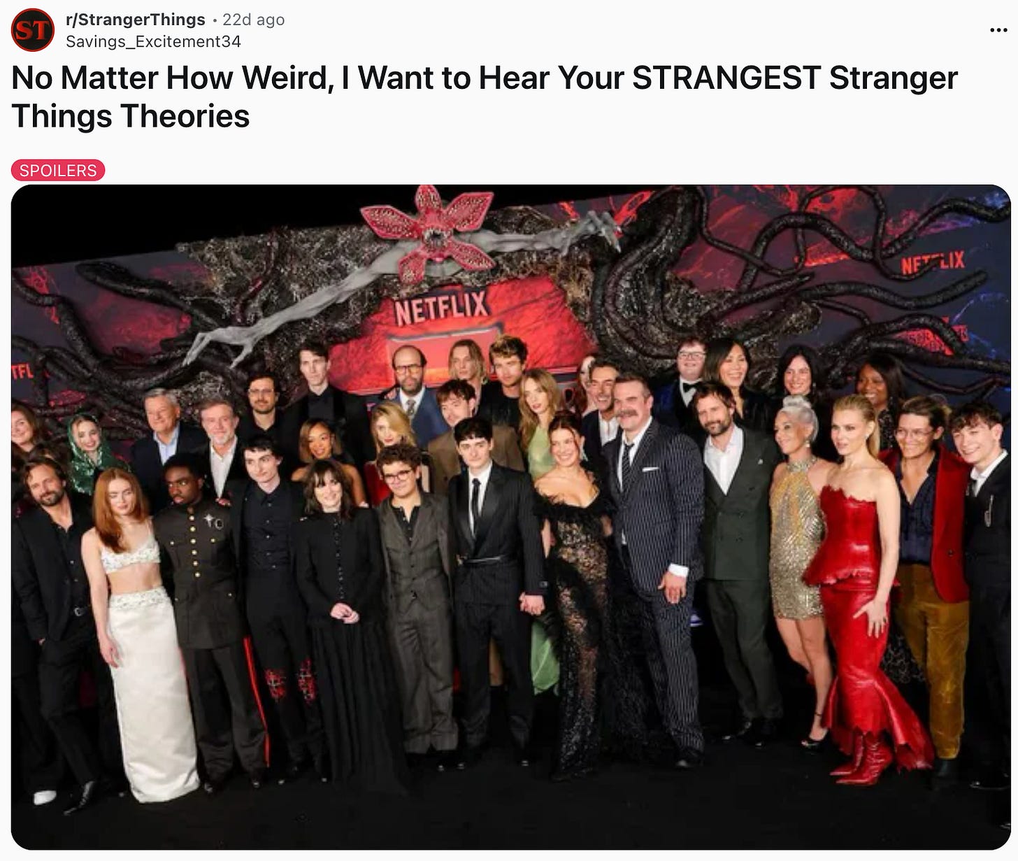 The release schedule was the masterstroke: four episodes at Thanksgiving, three at Christmas, and the finale on New Year’s Eve. It positioned Stranger Things not as content to binge, but as the show to watch this holiday season. By spacing the episodes across holidays, Netflix created a cadence of anticipation. Family gatherings turning into viewing parties, holiday downtime merging with narrative immersion, and the countdown to the finale aligning with the countdown to the new year.